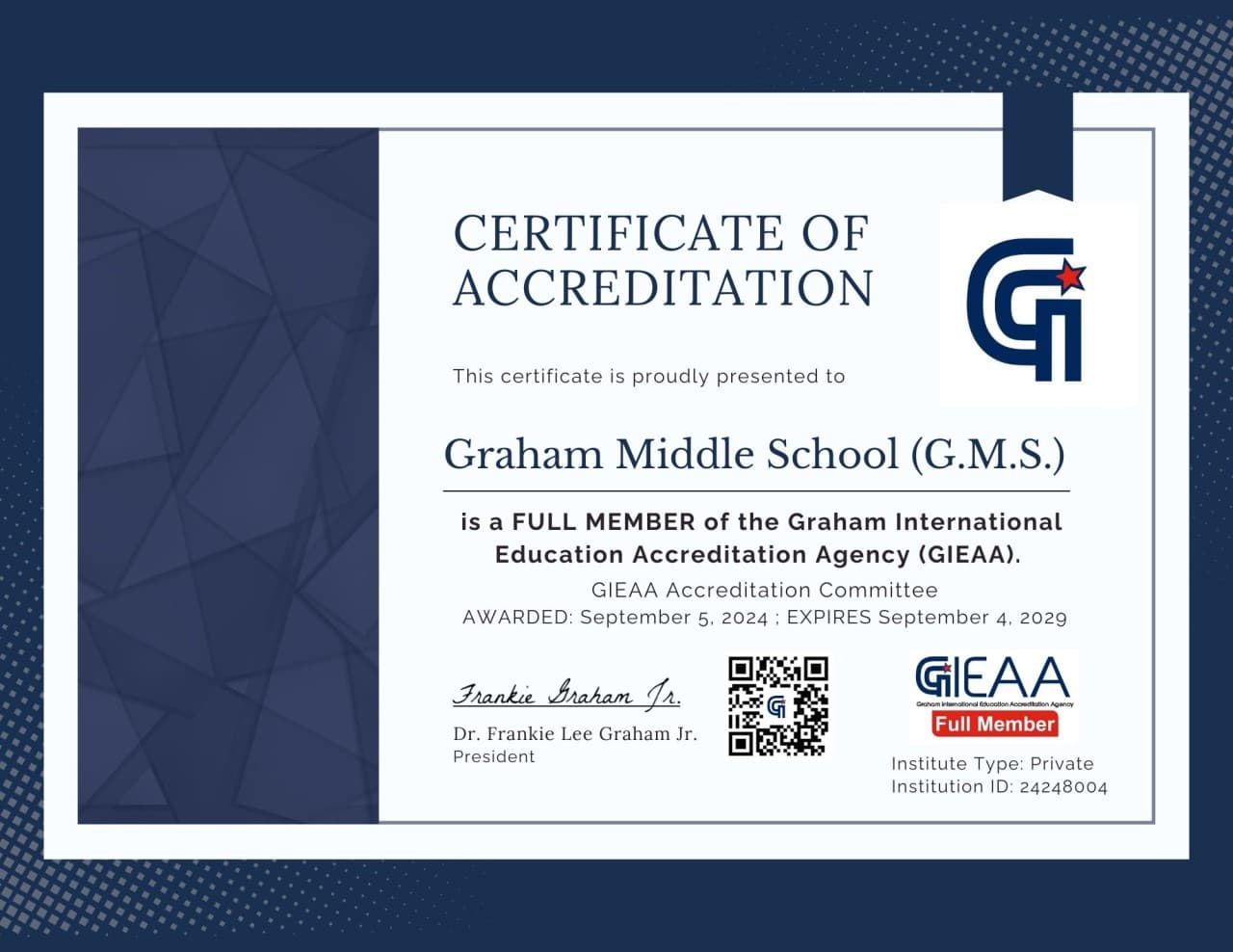 Graham Middle School achieved Full Accreditation from the Graham International Education Accreditation Agency (GIEAA). This recognition affirms the school’s commitment to maintaining the highest educational standards and ensuring excellence in curriculum development, teaching methods, and student success. GIEAA’s rigorous evaluation process guarantees that GMS adheres to international best practices, positioning its programs and graduates for global recognition.